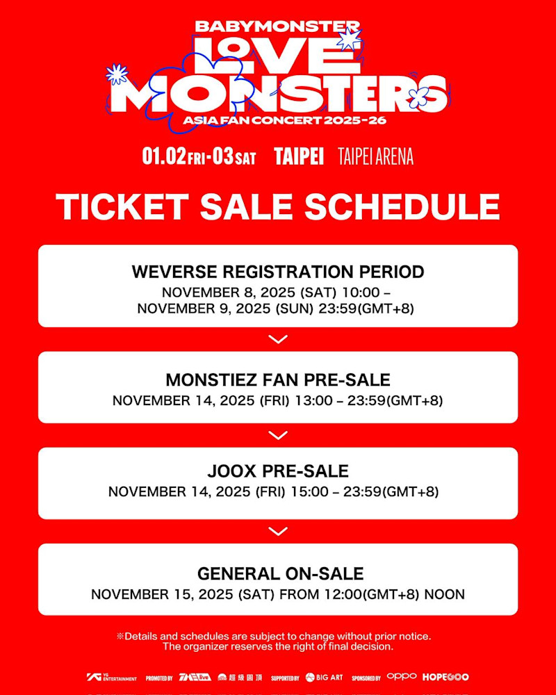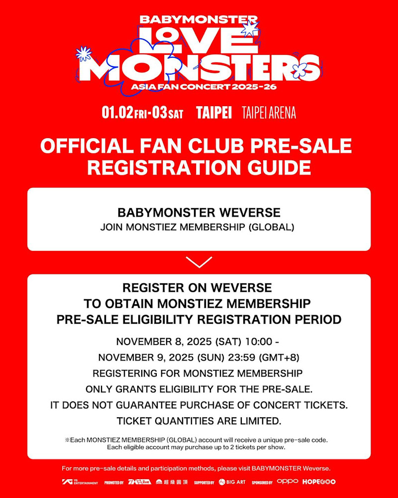 YG 娛樂旗下「怪物新人」女團 BABYMONSTER(베이비몬스터)正式宣布新年來台!她們將於 2026 年 1 月 2 日與 3 日,連續兩天首度登上台北小巨蛋,舉行「BABYMONSTER "LOVE MONSTERS" ASIA FAN CONCERT」台北站。這不僅是 BABYMONSTER 出道 3 年後首度攻蛋,也讓她們成為 2026 年首組在台北小巨蛋開唱的韓星。粉絲們請務必鎖定 KKTIX 售票時間,詳細資訊整理如下。