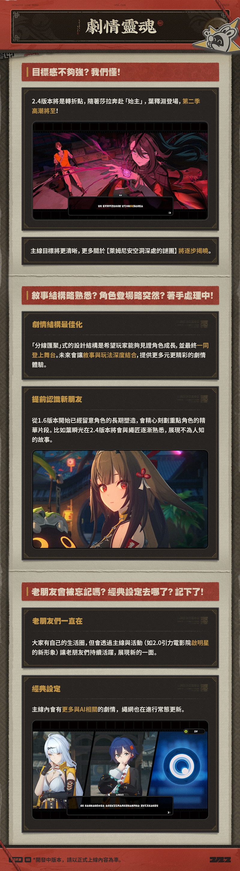 劇情目標更清晰: 繼2.0版本伊卡洛斯事件的「意難平」後,2.4版本的主線將圍繞葉萊、孫嵐等角色展開,這將是 2.4 版本的主線劇情更新 (ZZZ Story Update) 的高潮。