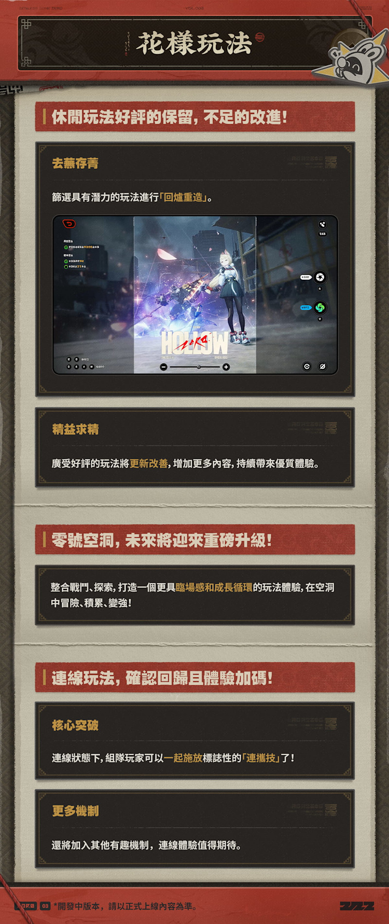 作為遊戲的核心肉鴿 (Rogue-lite Mode) 玩法,「零號空洞」(Hollow Zero) 也將迎來玩法更新 (Hollow Zero Update)。策劃反思了早期版本(如1.4「航天城」)過於「線性闖關」的體驗,表示未來的「零號空洞」將朝著2.0版本「枯萎的區域」(Withered Domain)的方向發展,給予玩家更廣闊的空間與更自由的探索體驗。